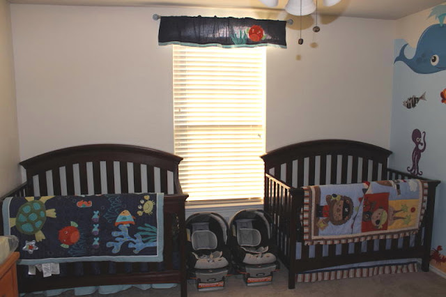 There are a few details (like a clock - he, he) and a taller bookshelf but the decor is done and everything is put together. =) I'd also like to put up initials above the cribs, but that'll be a later pic.